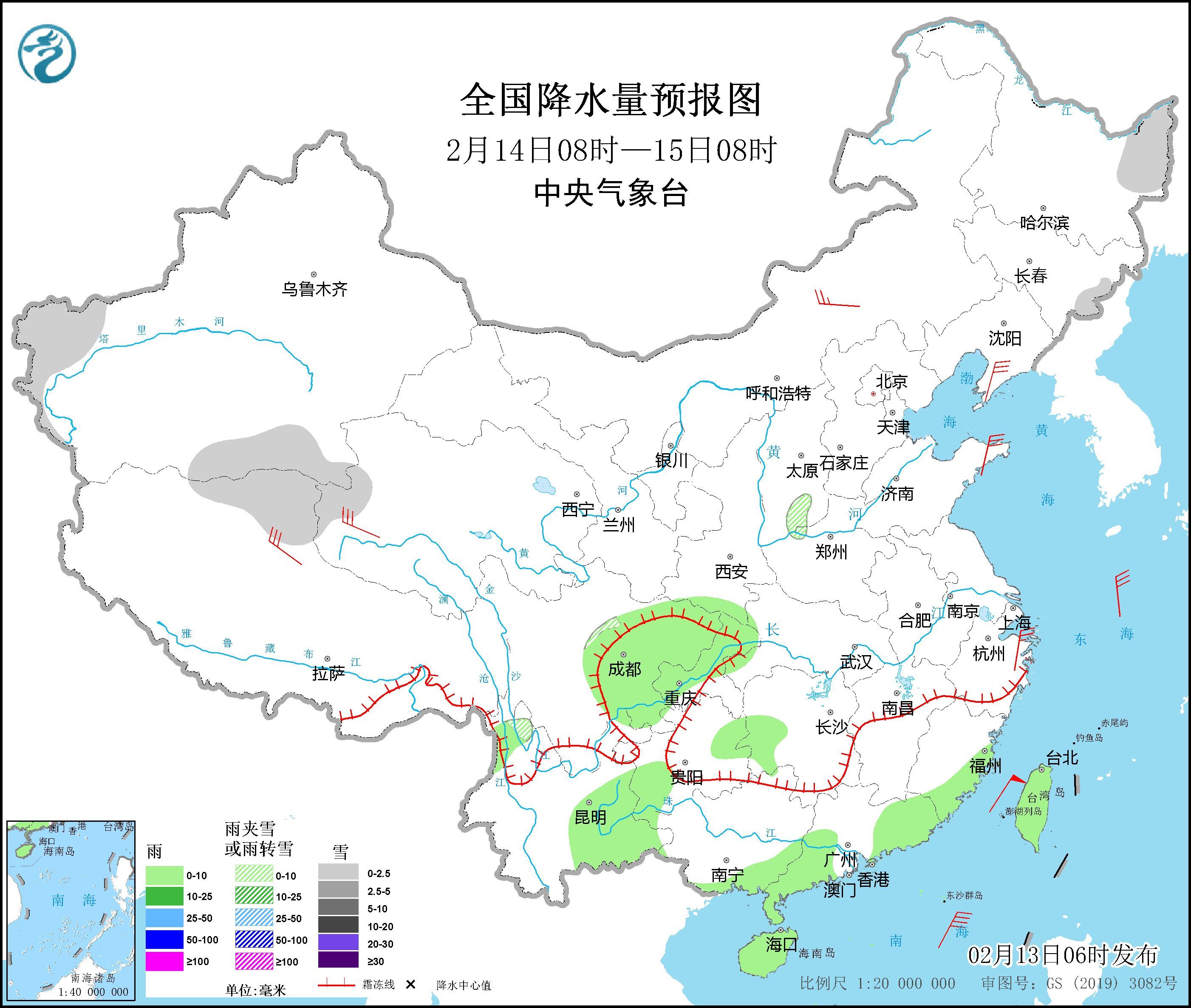 全国降水量预报图(2月13日08时-14日08时)图片来源:中央气象台网站