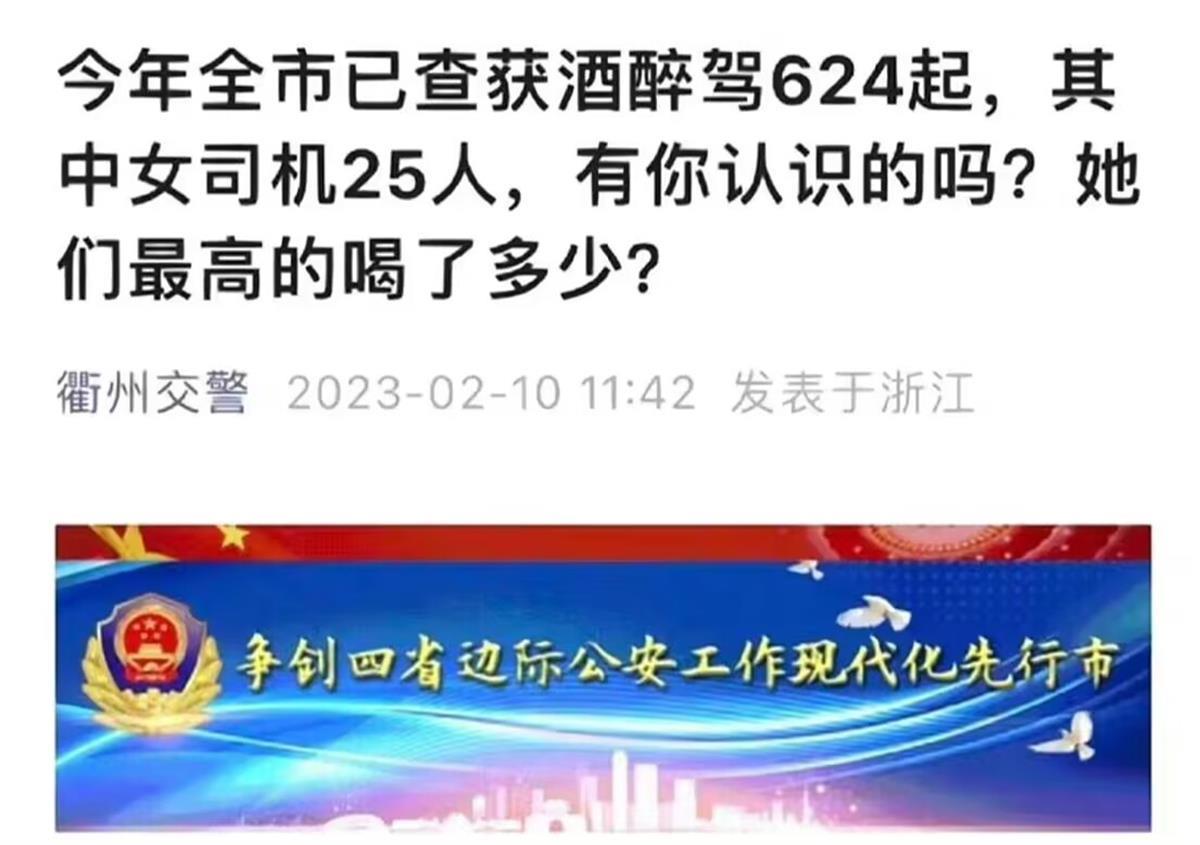 近日,浙江省衢州市交警支队官微发布了一则题为《今年全市已查获酒醉驾624起,其中女司机25人,有你认识的吗?她们最高的喝了多少?》的文章,文中指出了25名酒醉驾女司机的姓名、车牌号、违法时间等信息。相反,599名酒醉驾男司机的信息未被提及。目前,该文章已被删除。此事登上网络热搜,引发热议。