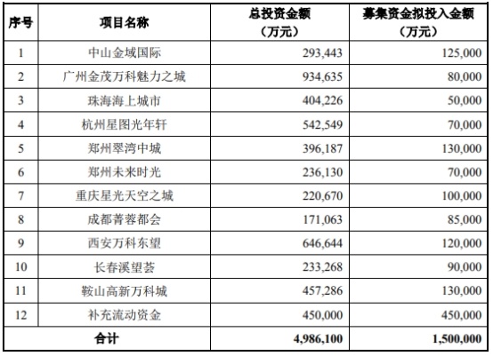 昨晚,万科A披露了2023年度非公开发行A股股票预案。公司本次非公开发行股票的募集资金总额不超过人民币150.00亿元(含本数),扣除发行费用后的募集资金净额将全部用于以下项目:中山金域国际、广州金茂万科魅力之城、珠海海上城市、杭州星图光年轩、郑州翠湾中城、郑州未来时光、重庆星光天空之城、成都菁蓉都会、西安万科东望、长春溪望荟、鞍山高新万科城、补充流动资金。