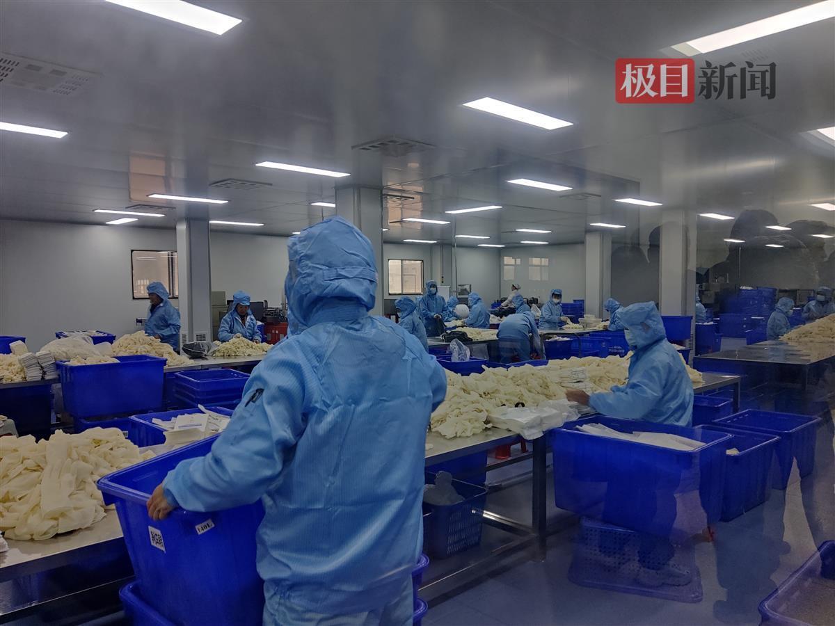 在湖北卓亚医疗器械嘉鱼有限公司的生产车间,130米长的生产线正载着手套模具不断转动。据公司负责人周建文介绍,目前公司正处于试生产阶段,一天可生产13万双医用手套。预计今年4月正式投产,产量会大幅提升。除了医用手套,棉签、口罩等卫材也是公司今后的重要产品。在另一车间,极目新闻记者隔着玻璃看到,工人们正在无菌环境里将口罩、棉签等进行包装封箱。