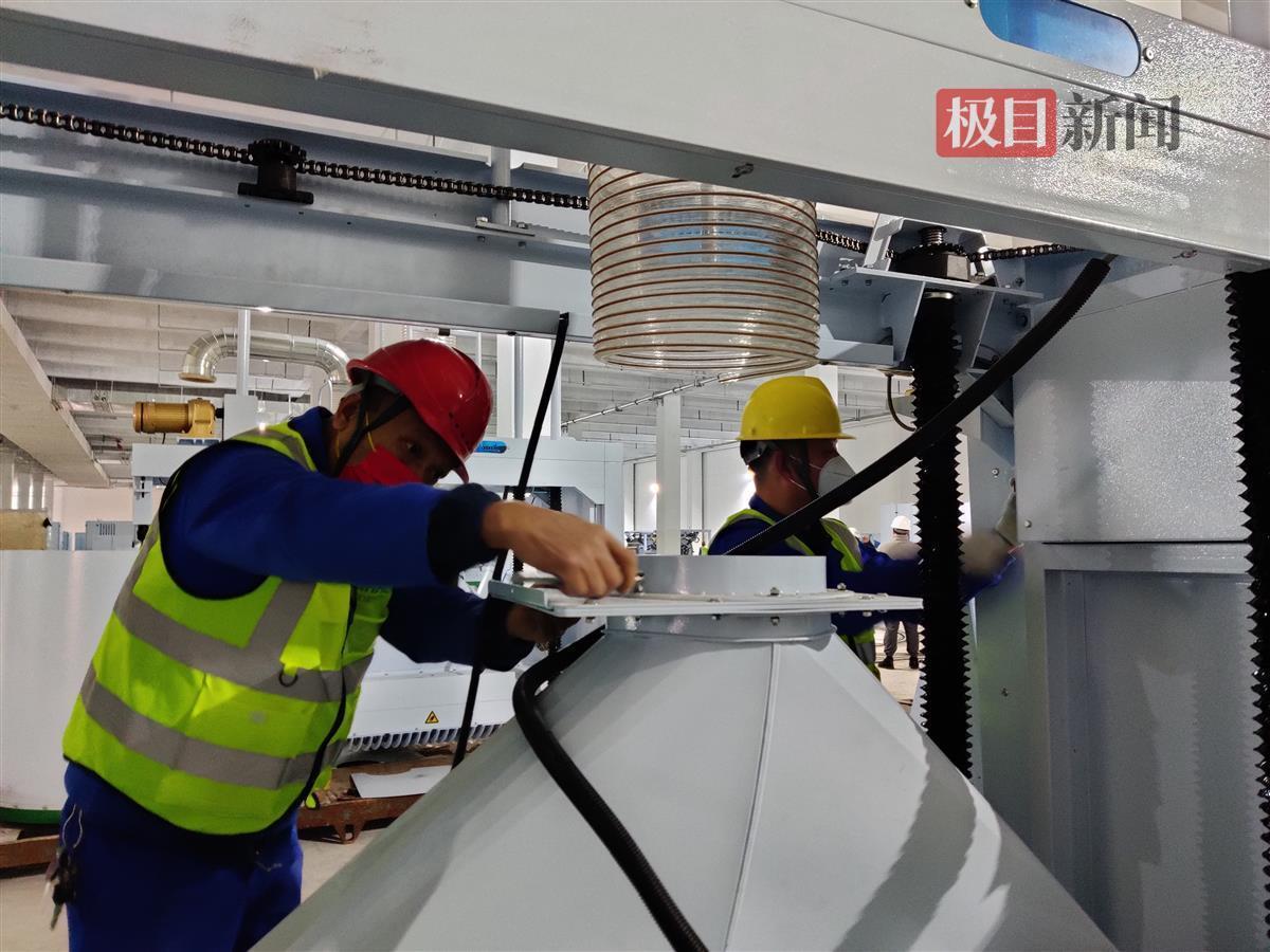 稳健医疗(嘉鱼)科技产业园项目建设工地,工人在安装设备