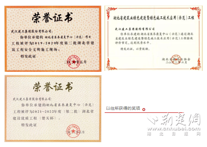 截至目前,湖北省医养康复中心(示范)项目先后荣获湖北省建设优质工程、全国建设工程项目施工安全生产标准化工地、湖北省建筑工程安全文明施工现场、全国工程建设质量小组QC活动成果大赛“二类成果”、湖北省建设QC小组活动成果二等奖、湖北省建筑业新技术应用示范工程、全国绿色建造竞赛二等成果等23个奖项。