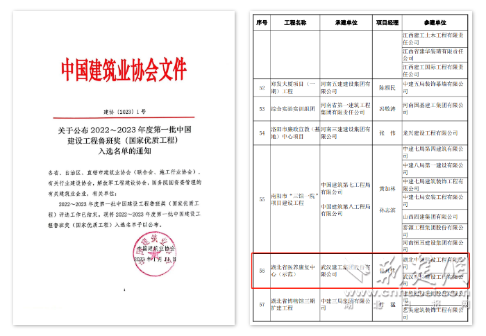 荆楚网(湖北日报网)讯(通讯员孙四海)近期,中国建筑业协会公布了2022~2023年度第一批中国建设工程鲁班奖(国家优质工程)入选名单,湖北省医养康复中心(示范)项目实力入选。