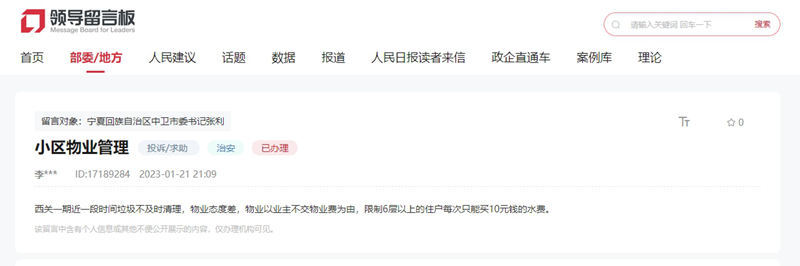 收到留言后,宁夏中卫市沙坡头区住建和交通局公开作出回复,表示立即责成相关部门进行办理。经核实,中卫市沙坡头区西关一期小区由中卫市华诚万家物业服务公司提供物业服务。