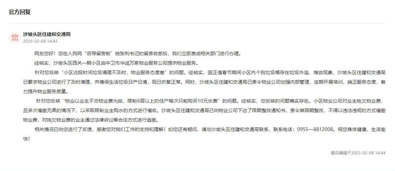 关于网友反映“小区近段时间垃圾清理不及时,物业服务态度差”的问题。经核实,因正值春节期间,小区内个别垃圾桶存在垃圾外溢、堆放现象,沙坡头区住建和交通局已要求物业公司进行了及时清理,并确保生活垃圾日产日清,现已恢复正常。同时,沙坡头区住建和交通局已责令物业公司加强内部管理,定期开展培训,端正服务态度,着力提升物业服务质量。