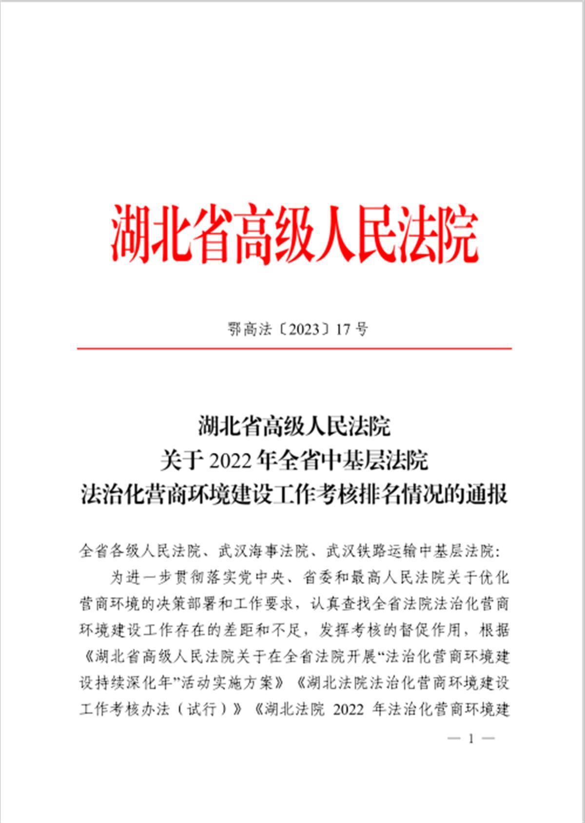 2月15日,极目新闻记者获悉,湖北省高级人民法院近日印发通报,公布2022年全省中基层法院法治化营商环境建设工作考核排名情况,3个中级法院和10个基层法院排名靠前。