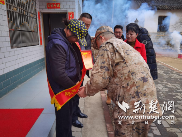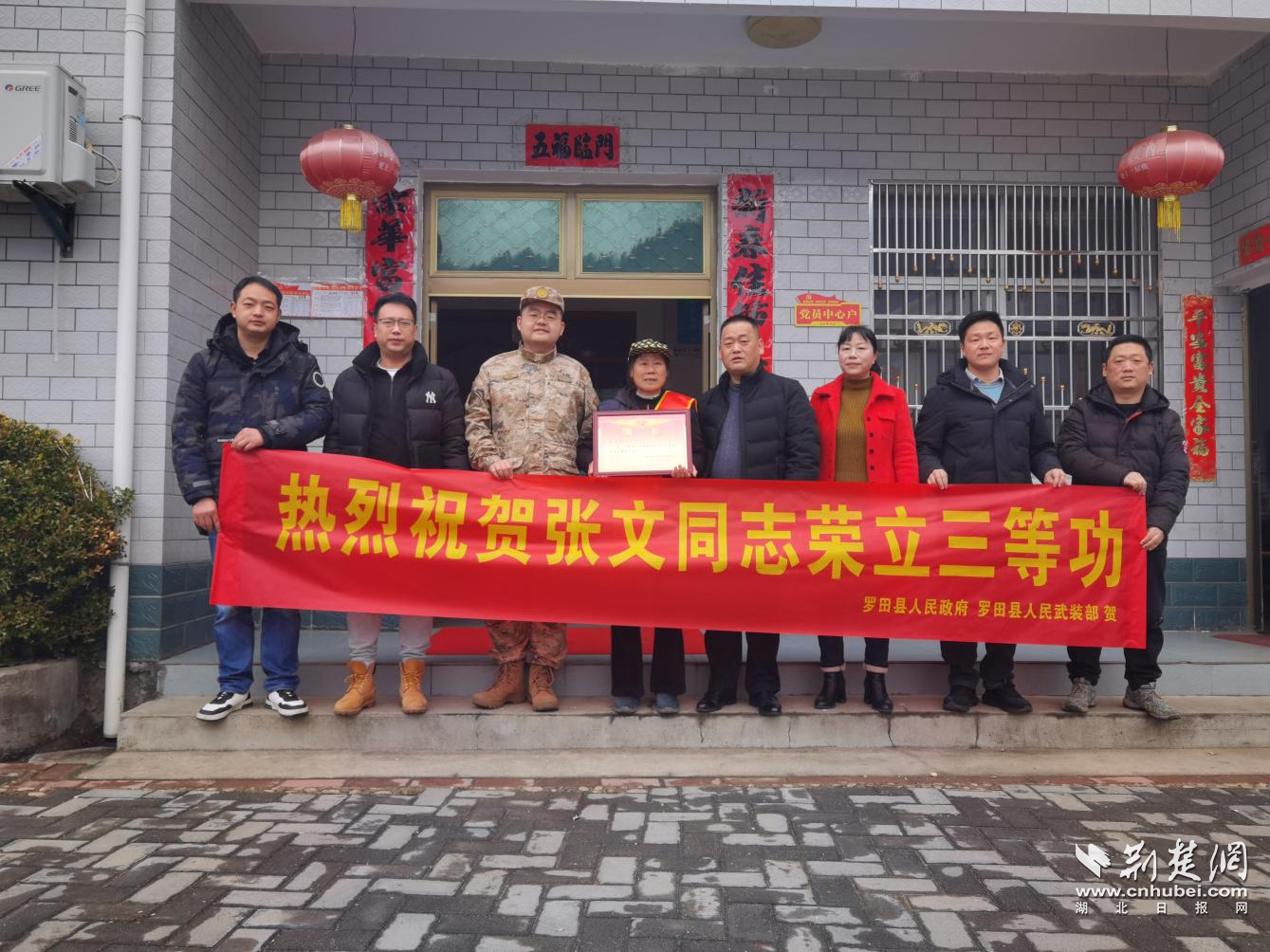 荆楚网(湖北日报网)讯(通讯员程洁 王宏禄)日前,罗田籍现役女军官、国防科技大学某院系技术上校张文荣立三等功。2月14日,由罗田县人武部、县退役军人事务局、九资河镇政府组成的送喜报小分队来到张文的家乡河西畈村,为其家庭送去立功喜报。