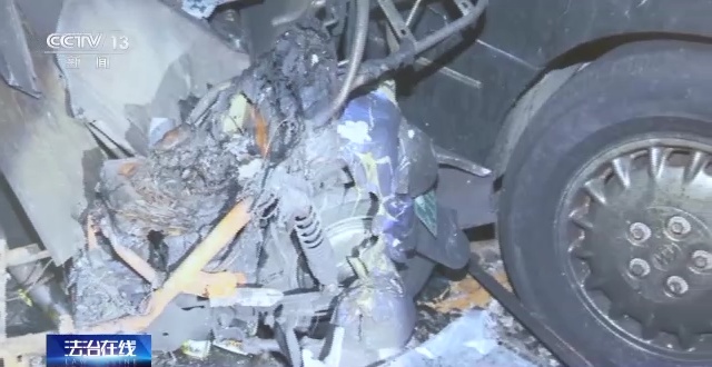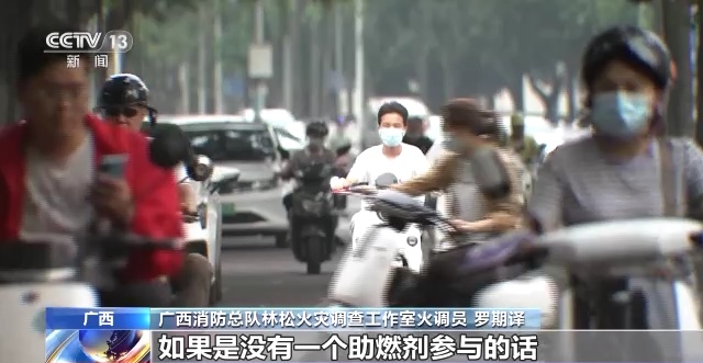 广西消防总队林松火灾调查工作室火调员 罗期译:电动自行车本身是一个固体燃烧,如果是没有一个助燃剂参与的话,它是不可能形成这么一个爆燃过程。勘验现场的时候,电动车周边是没有发现这种助燃剂这种情况,我们综合分析的话,还是跟当事人讲的这个(火灾)原因是不一样的。