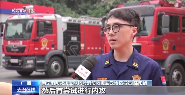 南宁消防救援支队凤岭消防救援站政治指导员 潘阳旭:有两个内攻小组,有尝试进行内攻,但是由于里面的环境不清楚是什么情况,并且浓烟比较大,内攻就没有那么顺利,到一半就退出来了。大概组织了两次,也都是以失败告终。