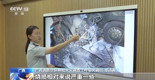 广西消防总队林松火灾调查工作室火调员 覃诗舟:汽车的轮胎还有外壳都是完整的,如果是电动车起火,这一块都不可能保留成现在这个状态。综合这些信息,我们就可以得出,电动车就不是这起火灾的起火部位。
