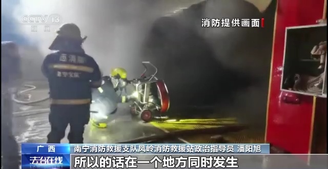 广西消防总队林松火灾调查工作室火调员 覃诗舟:进去(火场)之前我们就已经听说过当事人,受灾户的铺面老板说起他认为是一个电瓶车起火,所以我们肯定首先就会关注他说的电瓶车,我们进去也确实发现了他说的电瓶车。