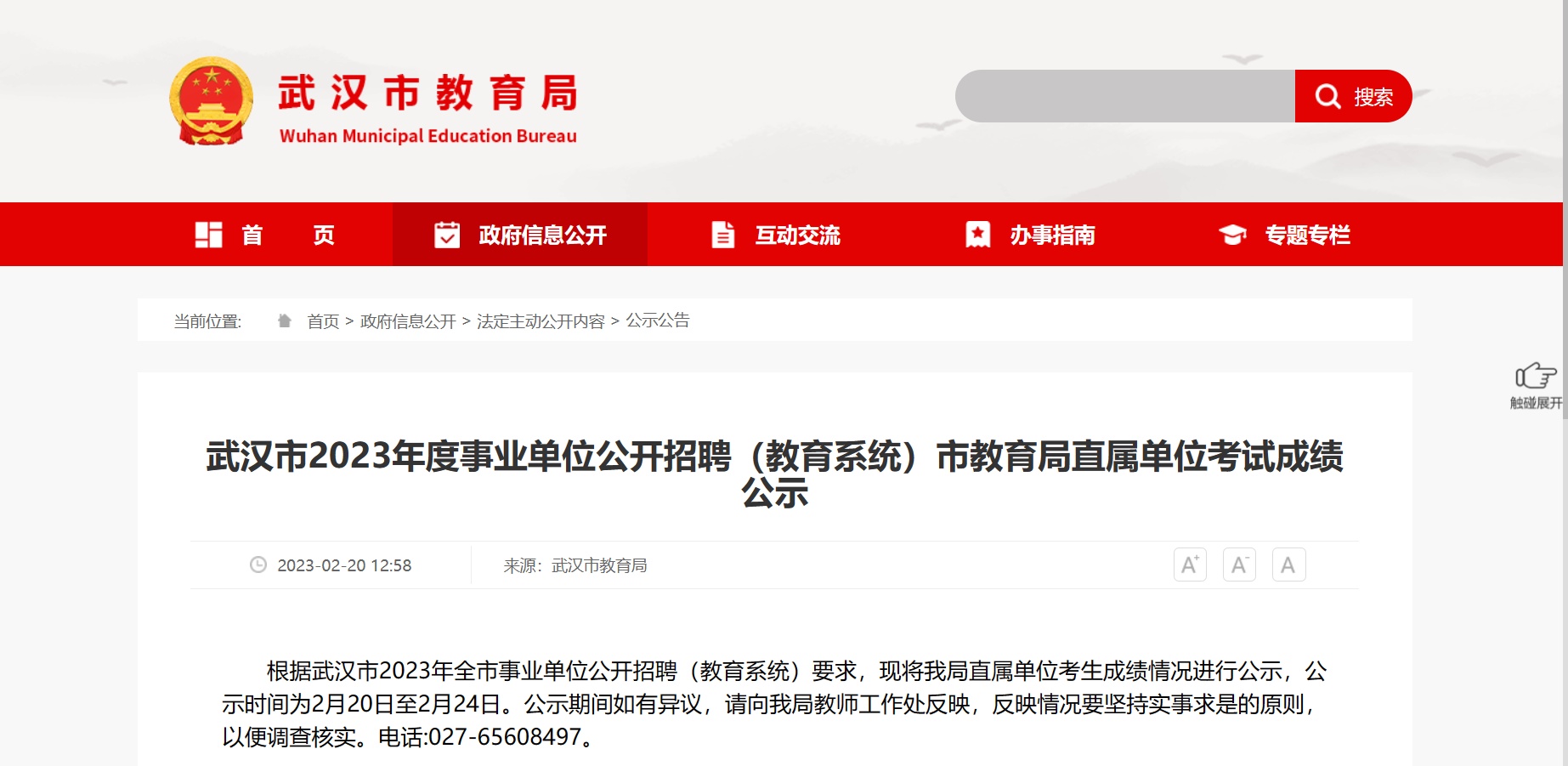 2月20日,武汉市教育局官网发布2023年度事业单位公开招聘(教育系统)市教育局直属单位考试成绩公示。