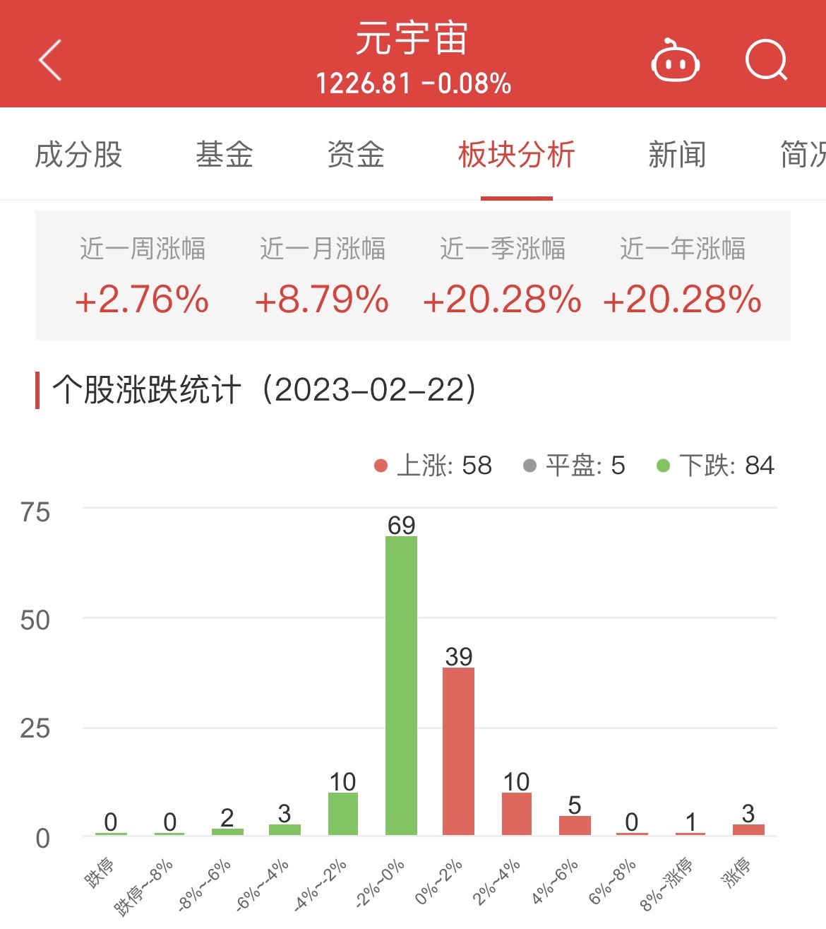 中国经济网北京2月22日讯 今日,元宇宙板块整体涨幅-0.08%,其中58只股票上涨,5只股票平盘,84只股票下跌。