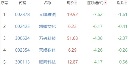 元隆雅图、凯撒文化、万兴科技、天娱数科和顺网科技位列涨幅榜后五位,涨幅分别为-7.62%、-6.17%、-4.38%、-4.26%和-4.17%。