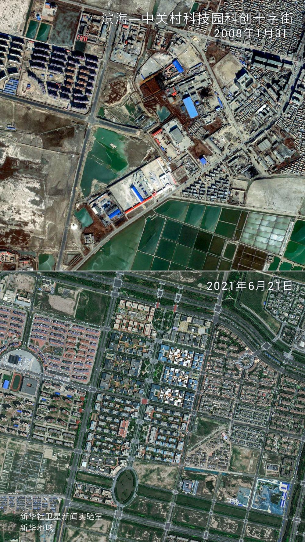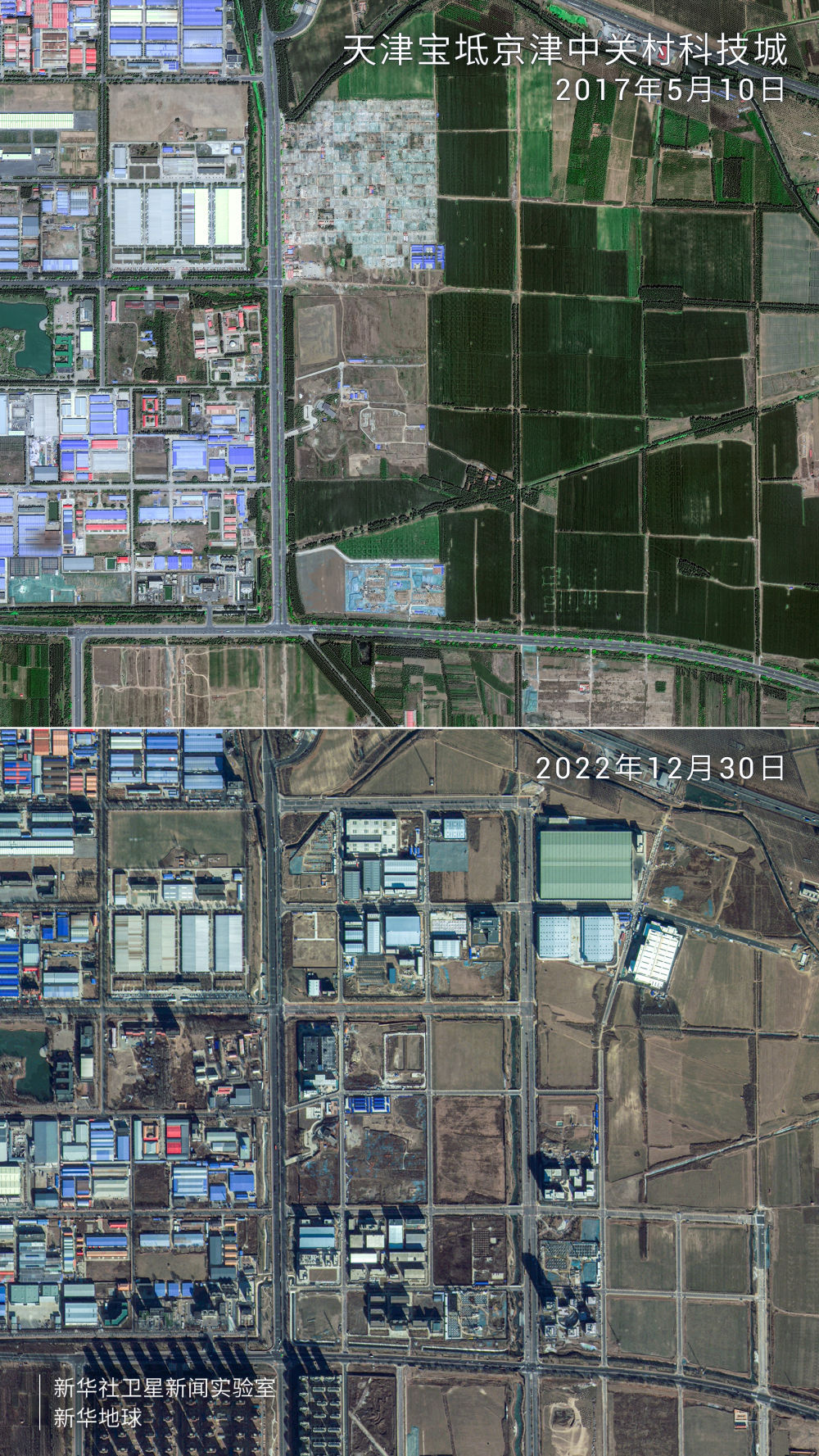 卫星拍摄的天津滨海—中关村科技园科创十字街前后对比图。