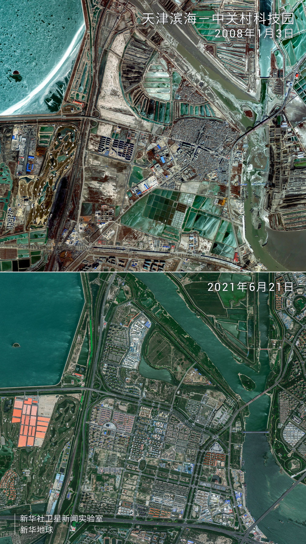卫星拍摄的天津滨海—中关村科技园前后对比图。