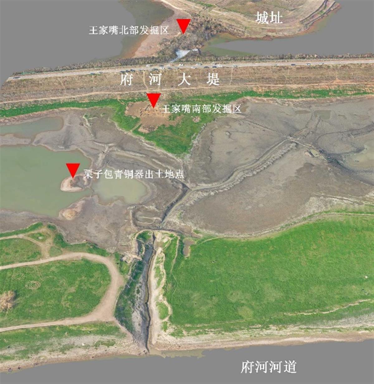 王家嘴地点鸟瞰及2022年发掘位置(上北)。