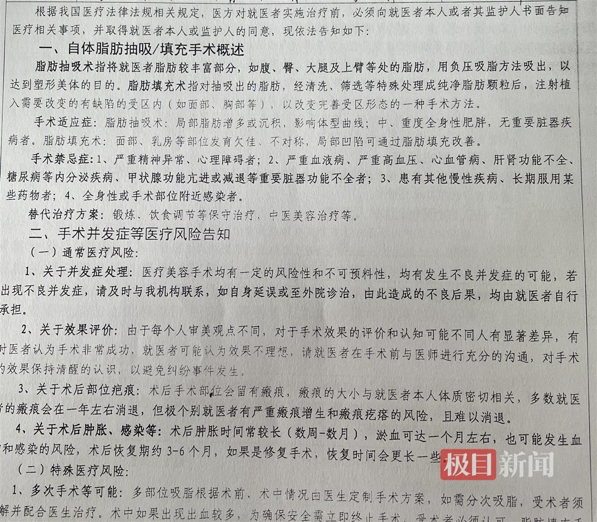 在朱女士签字的脂肪抽吸及填充手术术前知情同意书上,记者看到写有关于效果的解释:“由于每个人审美观点不同,对于手术效果的评价和认知可能不同人有显著差异,请就医者在手术前与医师进行充分沟通,对手术的效果保持清醒的认识,以避免纠纷事件发生。”