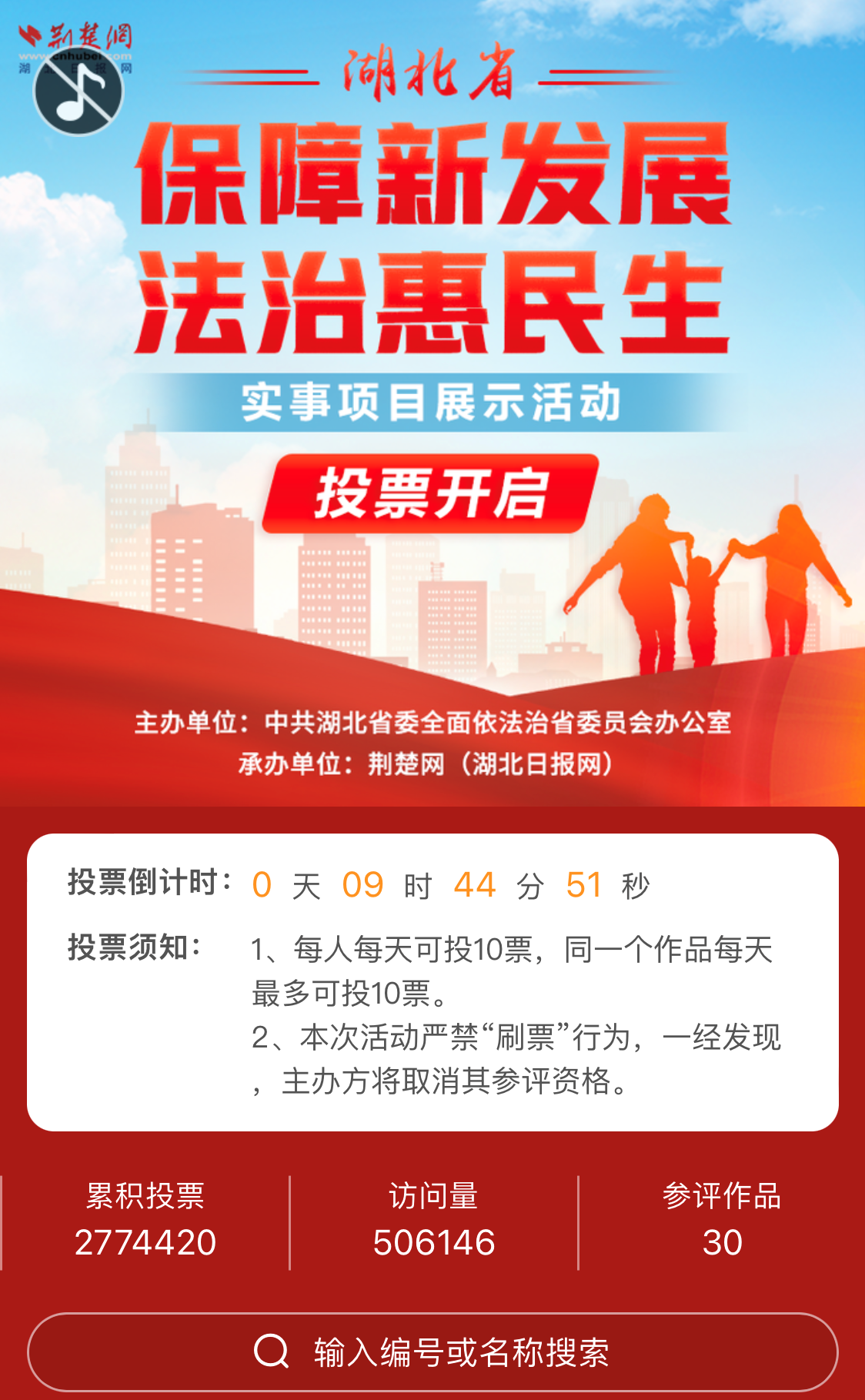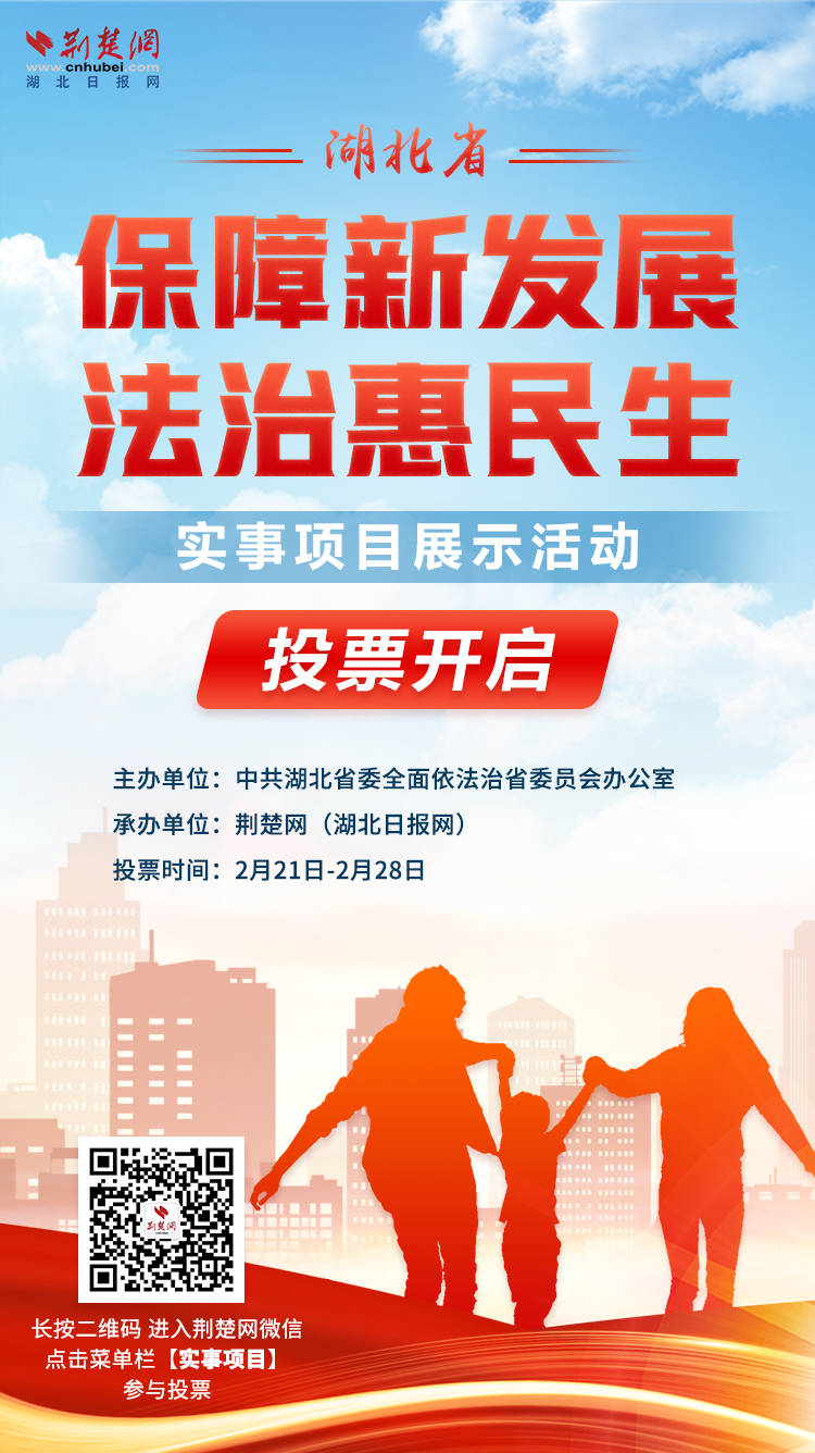 荆楚网(湖北日报网)讯(记者肖慧婷 通讯员王相生)由中共湖北省委全面依法治省委员会办公室主办,荆楚网(湖北日报网)承办的“保障新发展 法治惠民生”实事项目集中展示活动投票时间已经进入倒计时,截至2月28日14时,网络投票累计票数超270万,总访问量约50万人次。