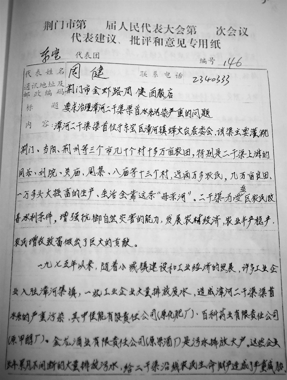 “我和你们都没有个人恩怨,但是要污染百万荆门人的饮用水,作为一名人大代表我绝不答应。”多年来,在为漳河保护发声时,这是周健说得最多的一句话。