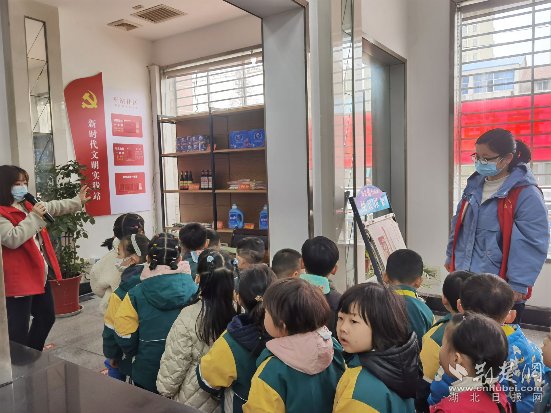 “这里是社区的办事大厅,有任何疑惑或困难都可以到这里来找我们。”社区工作人员热情地带领幼儿园的49名小朋友参观工作区、展示墙、会议室等地,详细地介绍了各功能区的用处。