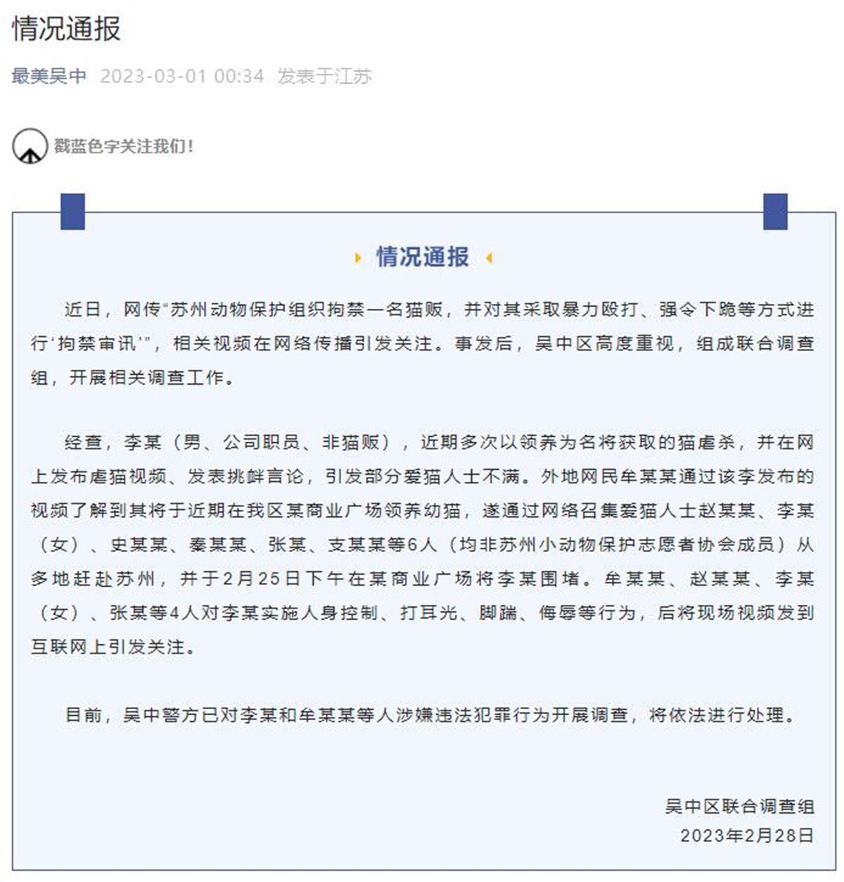 通报显示,近日,网传“苏州动物保护组织拘禁一名猫贩,并对其采取暴力殴打、强令下跪等方式进行‘拘禁审讯’”,相关视频在网络传播引发关注。事发后,吴中区高度重视,组成联合调查组,开展相关调查工作。 经查,李某(男、公司职员、非猫贩),近期多次以领养为名将获取的猫虐杀,并在网上发布虐猫视频、发表挑衅言论,引发部分爱猫人士不满。外地网民牟某某通过该李发布的视频了解到其将于近期在该区某商业广场领养幼猫,遂通过网络召集爱猫人士赵某某、李某(女)、史某某、秦某某、张某、支某某等6人(均非苏州小动物保护志愿者协会成员)从多地赶赴苏州,并于2月25日下午在某商业广场将李某围堵。牟某某、赵某某、李某(女)、张某等4人对李某实施人身控制、打耳光、脚踹、侮辱等行为,后将现场视频发到互联网上引发关注。 目前,吴中警方已对李某和牟某某等人涉嫌违法犯罪行为开展调查,将依法进行处理。