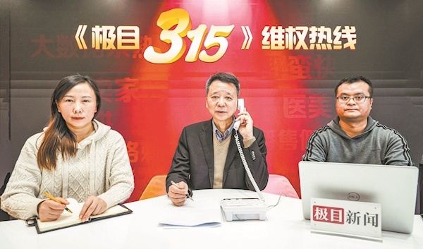 湖北省酒类流通行业协会会长顾虎(中)正在接听热线