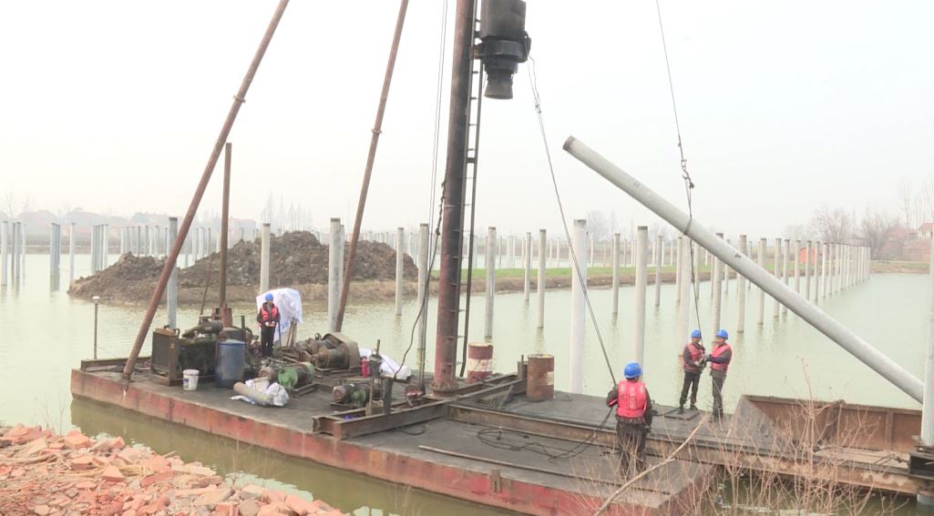 3月1日,在总投资达6.5亿元的华能热电应城市天鹅、黄滩渔光互补项目施工现场,一排排支撑太阳能的水泥预制管柱正在从水底升起,建设工人们正在抢晴天擂进度。该项目占地2400亩,涉及天鹅、黄滩多个村,其中天鹅镇有1200多亩水面,不仅改变了传统的养殖模式,而且每年可增加村级集体收入25多万元,解决劳动就业300多人。