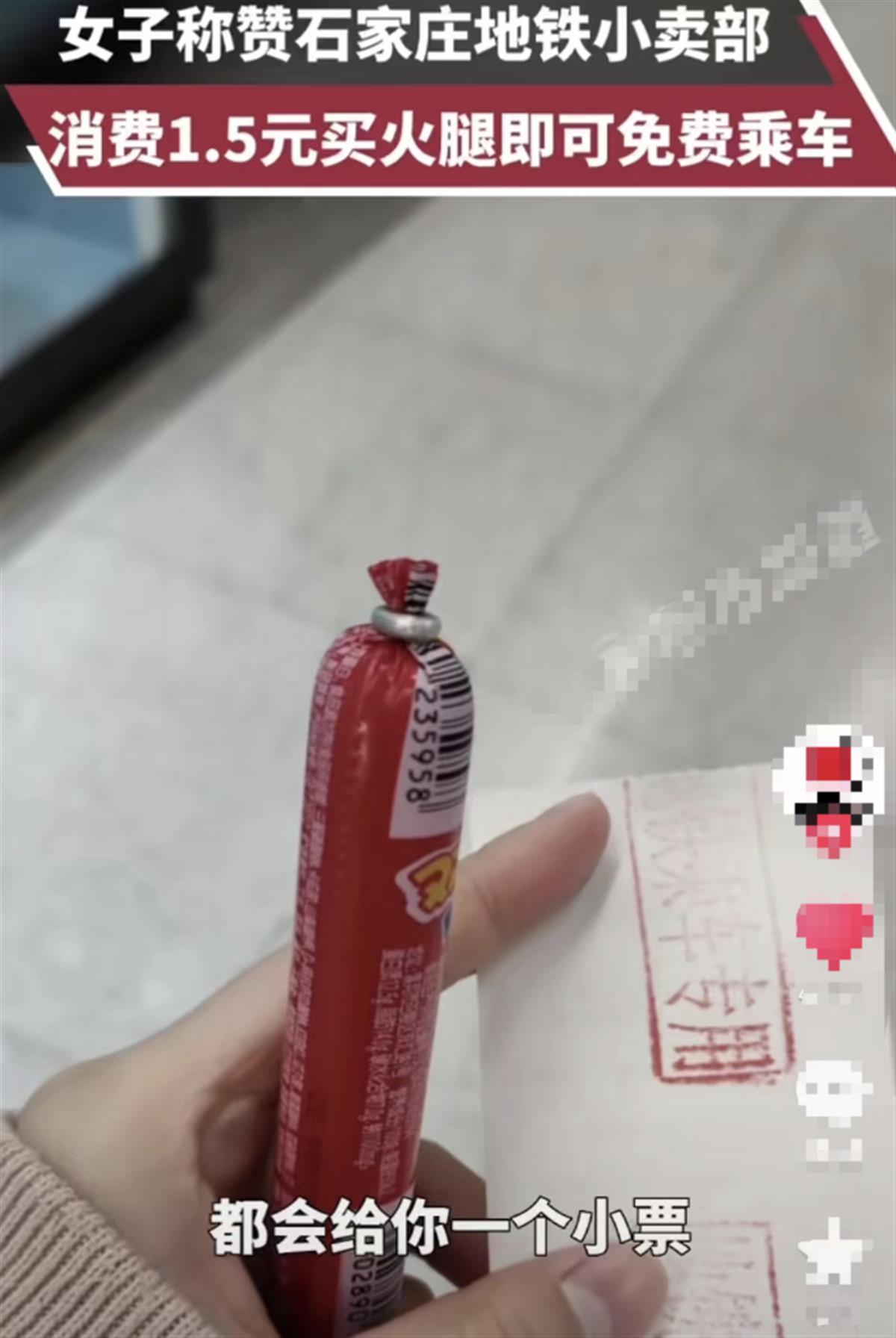 网友在石家庄买根火腿肠免费坐地铁(网络截图)