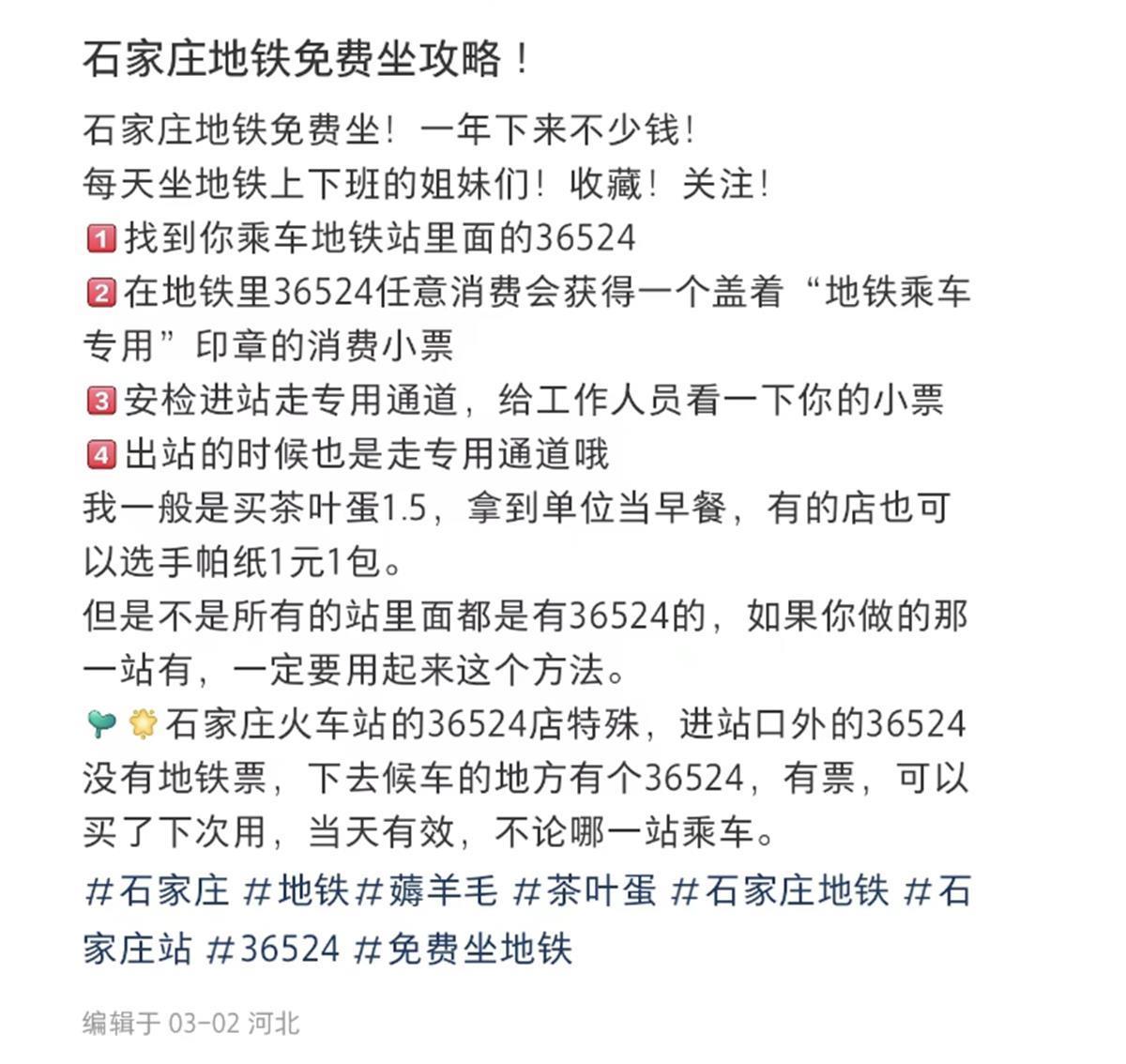 一名网友的“石家庄免费乘地铁攻略”提到,首先需要找到在地铁站内开设的36524便利店,消费任意金额都会得到一张小票,背面盖有“地铁乘车专用”章,进出站走人工专用通道,就可以实现免费坐地铁。还有网友“贴心”提示,买几样商品分开结算能得到多张小票,可以实现当天多人多次免费乘地铁。