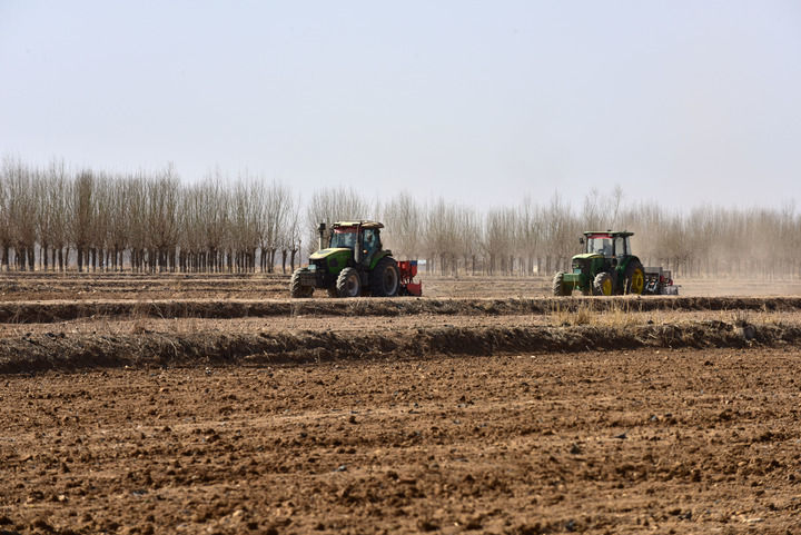 在宁夏银川市贺兰县立岗镇兰星村,农民驾驶农机播种春小麦(2023年3月3日摄)。新华社记者 李旭伦 摄
