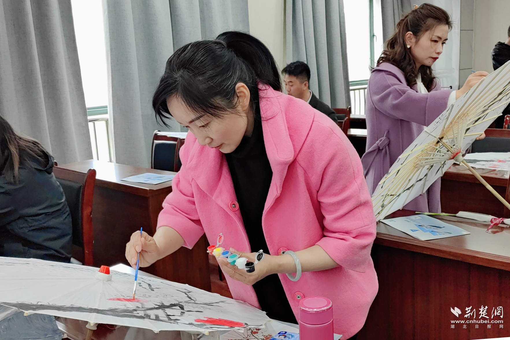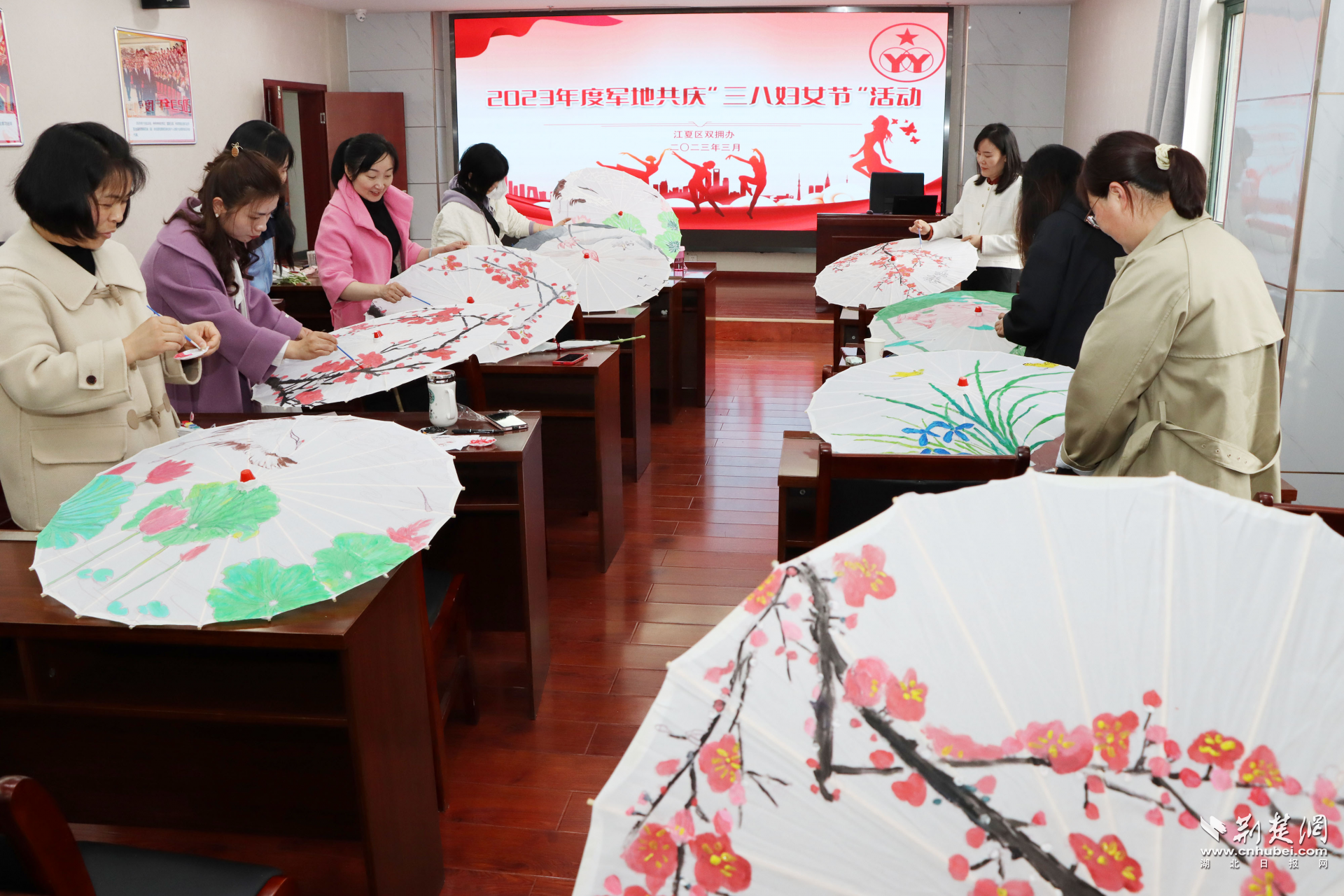 江夏区退役军人事务局干部职工和军属一起学就业技能、论创业项目、绘油纸伞。“你画的梅花特别好看……”“你的写毛笔字看起来也很生动……”你一言,我一语,整个活动洋溢着浓浓的鱼水情,军属们与大家纷纷举起手机留下难忘一刻。