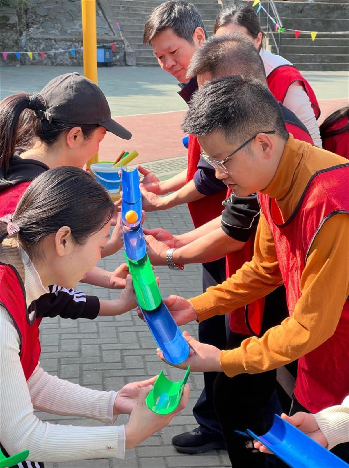 上午,队员们在“破冰之旅”的活动中建立了团队,选出了队长、队歌、队训,制作队旗,设计造型,帮助大家快速融入团建活动中。在“同心鼓”游戏中,大家体验了击中球带来的喜悦,明白了整合资源和团队协作的重要性。在“南水北调”活动中,老师们集思广益,心往一处使,尝试各种方法保证安全稳定地将水(乒乓球)在接力中运到既定区域,大家体会了合理分工的重要性。