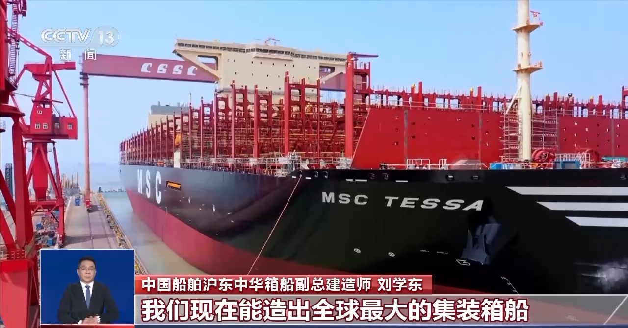 超大型集装箱船是世界上公认的高技术、高难度、高附加值的船舶之一,代表着一个国家的船舶建造水平。3月9日,我国自主研制的全球最大的超大型集装箱船“地中海 泰莎”号在中国船舶集团沪东中华造船厂交付。这艘“海上巨无霸”总长接近400米,比一艘航空母舰还要长,甲板面积近似于4个标准足球场,可以承载24万多吨的货物。这艘全球最大集装箱船有什么特殊之处?如何“带货”?我国在自主研制过程中攻克了哪些技术难点?创造了哪些中国“船”奇?