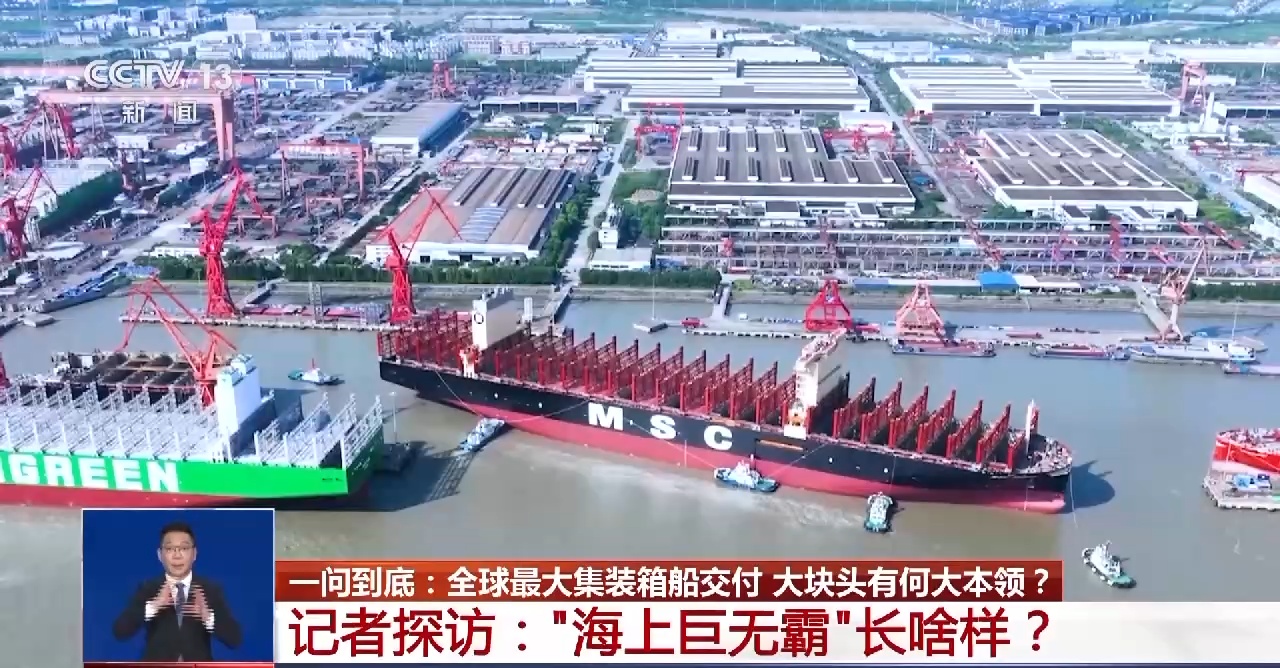 总台央视记者 李宁:今天交付的世界最大集装箱船,长度是399.99米,最大载货量是24116只标准集装箱,可以说是名副其实的“海上巨无霸”和“带货王”。