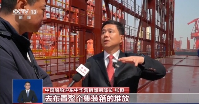 中国船舶沪东中华营销部副部长 张恒:船员根据配送中心提供的数据,去布置整个集装箱的堆放。尽量把重的箱子堆在下面,轻的箱子放在上面,根据货品的需求和要求,由配货中心发出指令,给船员和集装箱码头吊装指令。