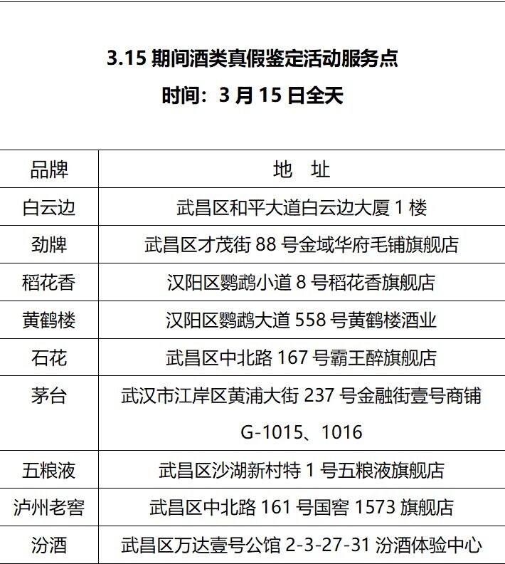 据悉,3月15日,白云边、劲牌、稻花香、黄鹤楼、石花、茅台、五粮液、泸州老窖、汾酒等知名品牌,还将在武汉设置“酒类真假鉴定活动服务点”,帮助消费者甄别产品真假、增长辨伪知识、维护消费权益。