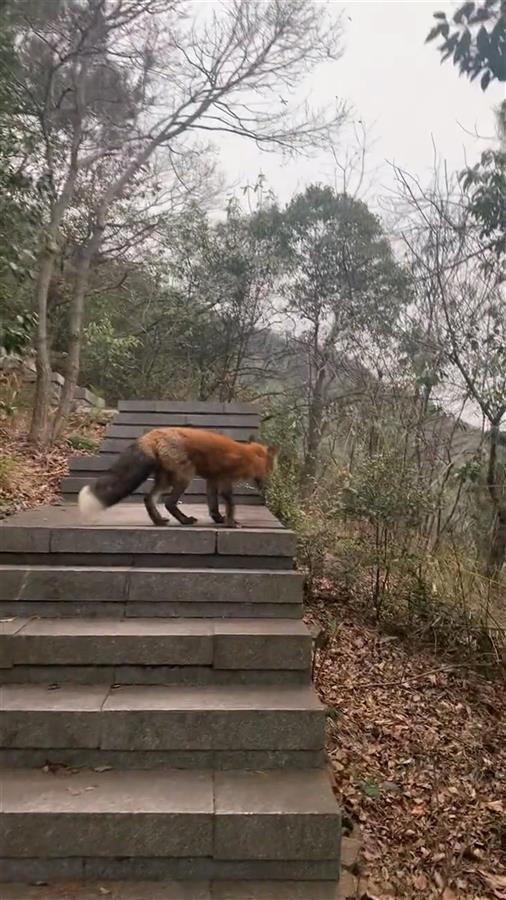 3月13日,张先生告诉极目新闻记者,3月8日下午,他在午潮山国家森林公园内的白岩山爬山。一只赤色狐狸突然出现在前方的石板路上,他瞬间感觉害怕,但狐狸没有攻击或躲避他,一边前进还一边停下来等他。就这样持续了不到两分钟,狐狸又突然消失在视野中。