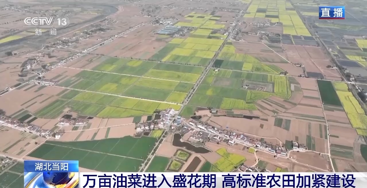 总台记者 鄢艳:这里是湖北当阳市的万亩高标准农田,随着气温的回升农田里的油菜花已经竞相开放。从航拍镜头中看,鲜艳的青绿色铺满了规整的田块,组成了一幅美丽的乡村油画。