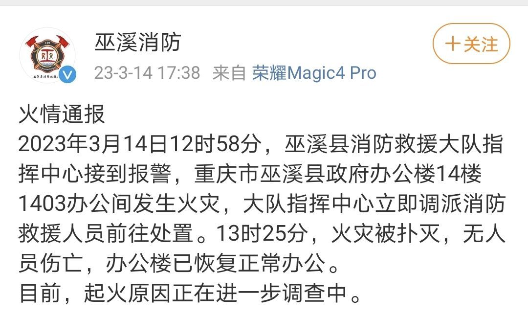 重庆市巫溪县消防救援大队官方微博“巫溪消防”3月14日下午17:38分发布《火情通报》介绍,2023年3月14日12时58分,巫溪县消防救援大队指挥中心接到报警,重庆市巫溪县政府办公楼14楼1403办公间发生火灾,大队指挥中心立即调派消防救援人员前往处置。13时25分,火灾被扑灭,无人员伤亡,办公楼已恢复正常办公。目前,起火原因正在进一步调查中。