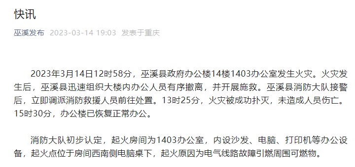 “巫溪发布”微信公众号3月14日晚19:03分发布信息称,火灾发生后,巫溪县迅速组织大楼内办公人员有序撤离,并开展施救。15时30分,办公楼已恢复正常办公。消防大队初步认定,起火房间为1403办公室,内设沙发、电脑、打印机等办公设备,起火点位于房间西南侧电脑桌下,起火原因为电气线路故障引燃周围可燃物。