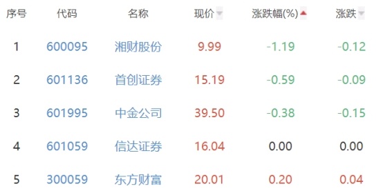 湘财股份、首创证券、中金公司、信达证券、东方财富位列涨幅榜后五位,涨幅分别为-1.19%、-0.59%、-0.38%、0.00%、0.20%。
