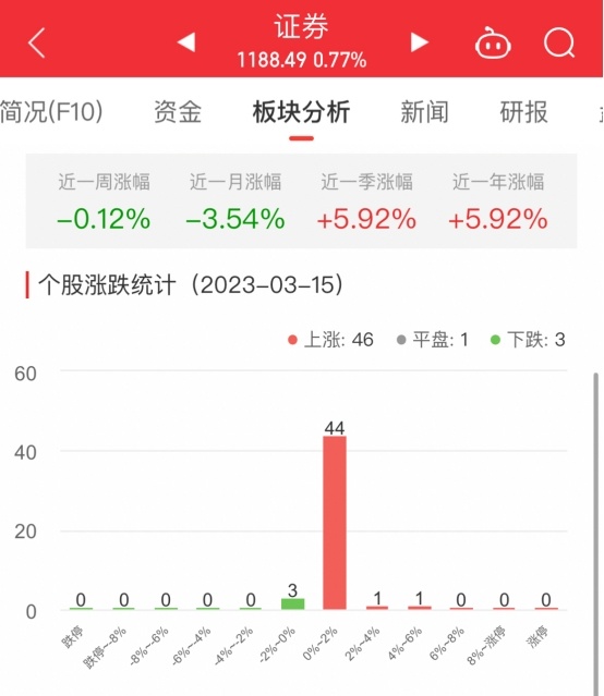 中国经济网北京3月15日讯 今日,证券板块整体涨幅0.77%,其中46只股票上涨,1只股票平盘,3只股票下跌。