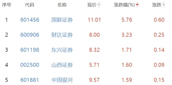 其中,国联证券、财达证券、东兴证券、山西证券、中国银河位列板块涨幅前五位,涨幅分别为5.76%、3.23%、1.71%、1.60%、1.59%。