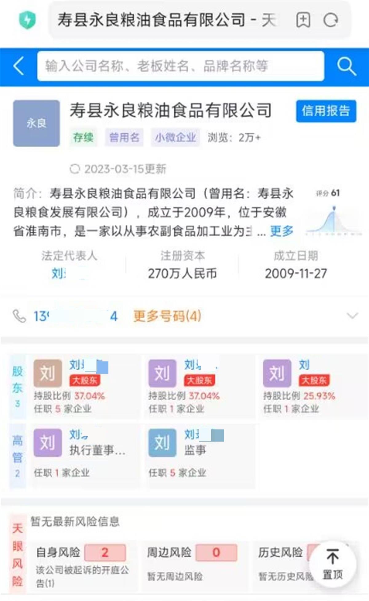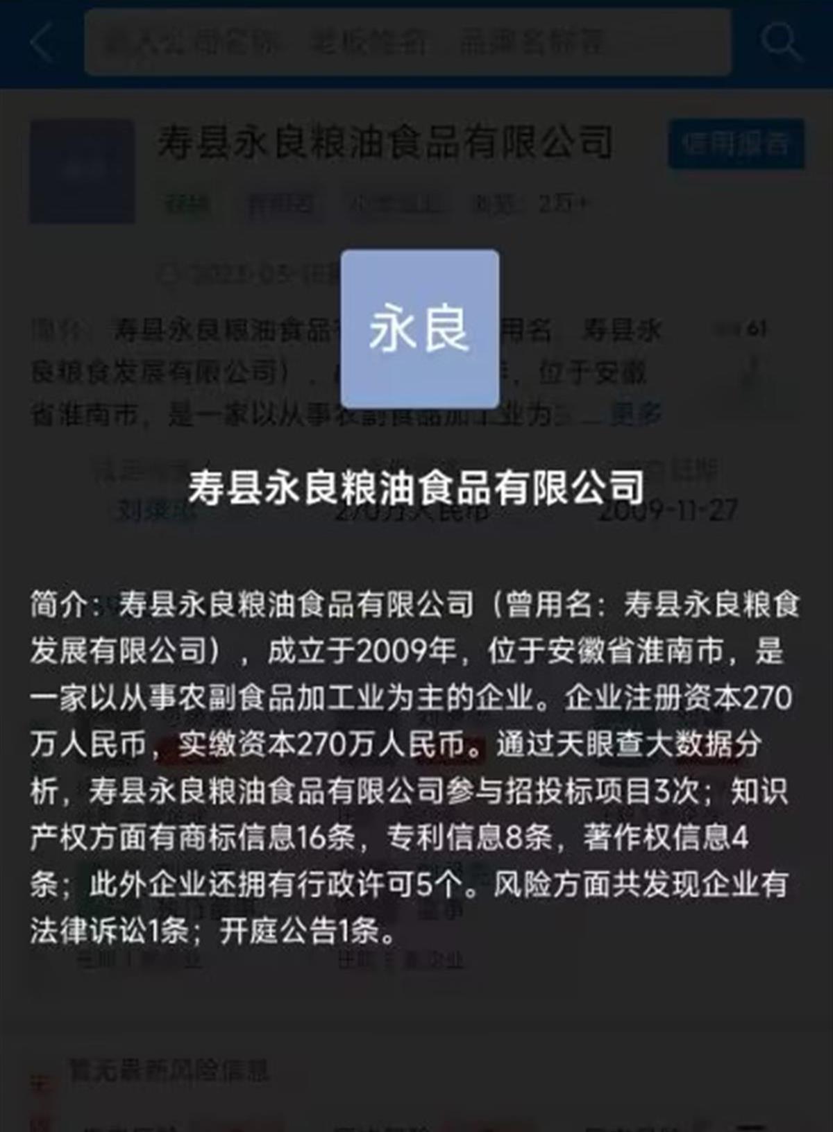天眼查App显示,寿县永良粮油食品有限公司成立于2009年11月,法定代表人为刘某忠,注册资本270万人民币,经营范围包括大米生产、销售,粮食收购、销售,油菜籽收购、销售等,由刘某忠和另两人共同持股。双随机抽查显示,该公司曾在食品生产监督检查项目中被发现问题并责令改正。此外,该公司已申请注册“泰子王”等商标。