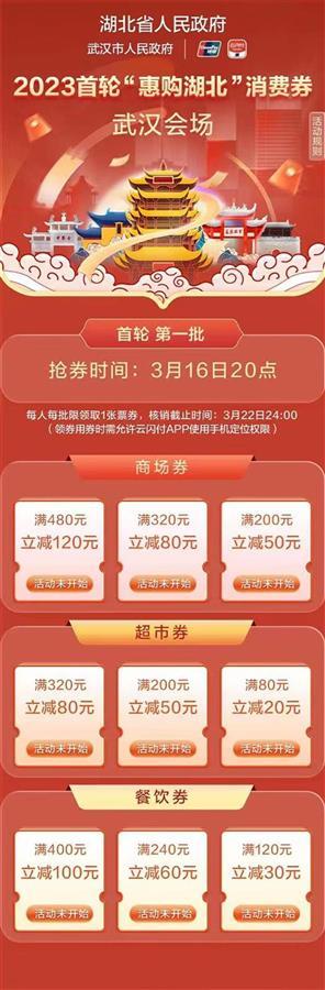 据了解,首轮“惠购湖北”消费券共投放3个批次,其中:第一批于2023年3月16日20:00至3月22日24:00期间投放使用;第二批于2023年3月25日20:00至3月31日24:00期间投放使用;第三批于2023年4月18日20:00至4月24日24:00期间投放使用。依然分为商场券,面额有50元、80元、120元三种;超市券,面额有20元、50元、80元三种;餐饮券,面额有30元、60元、100元三种。