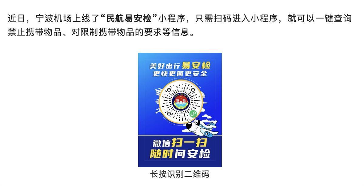 机场已上线“民航易安检”小程序查询(图源:微信公号“宁波机场”)