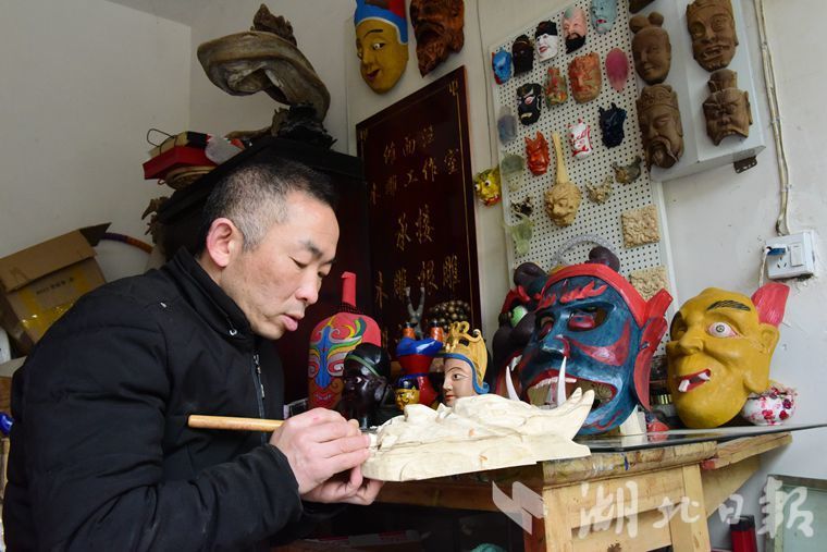 “当时共有8名学员,学成的有4人,现在还在制作傩面具的,只剩我一人。”汪儒斌说,出于对傩面具制作技艺的痴迷,他坚守至今。