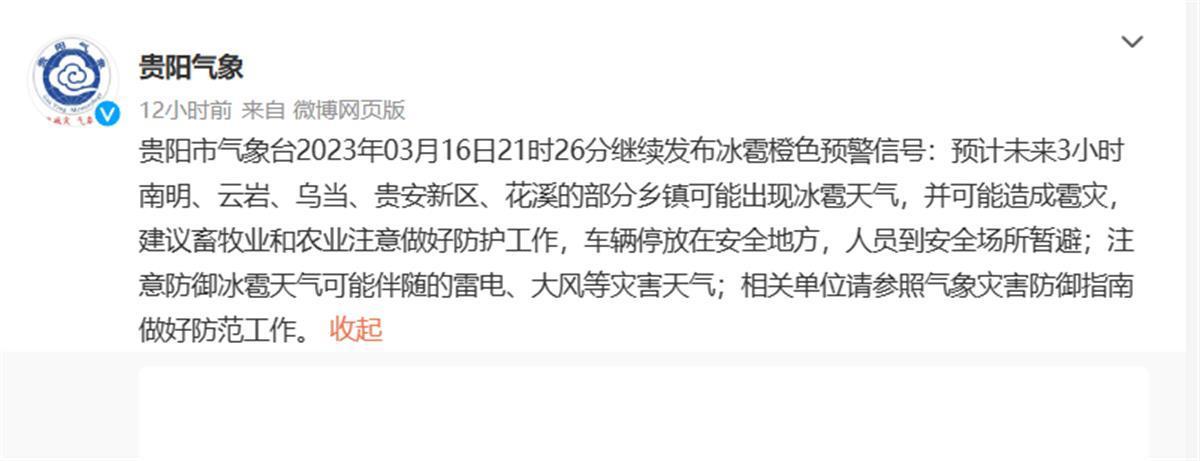 3月16日,贵阳市气象台连发冰雹预警信号,预计南明、云岩、乌当、贵安新区、花溪的部分乡镇可能出现冰雹天气,并可能造成雹灾,建议畜牧业和农业注意做好防护工作,车辆停放在安全地方,人员到安全场所暂避。