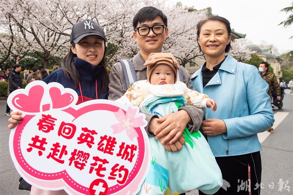 刘瑜是江西省赣州市龙南市第一人民医院的护士,三年前的樱花时节,她作为江西省援鄂医疗队队员,在方舱医院为病患提供护理服务。三年后,武大樱花满园,她带着外公、母亲和出生4个月的宝宝,四世同堂来汉赏樱。在来看樱花的路上,有专车接送、专人讲解,刘瑜一家第一次走上红地毯,一家人感动于热情的武大学子、武汉人民。宝宝在怀中静静酣睡,但他们的开心溢于言表,刘瑜尤其感慨于武汉如今的朝气与活力:“三年前,大街小巷空空荡荡,现在的武汉车水马龙,祝福武汉和武汉人民越来越好。”
